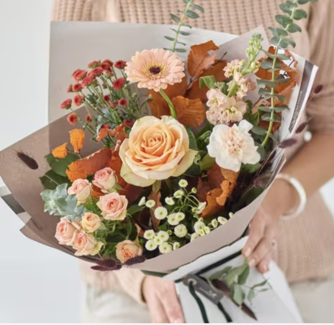 A stylish arranged selection in a soft grey concrete pot with natural base, (Due to Covid this pot may be substituted to  Hat box or aluminium tins) including colours of your choice. Many colours available – please add details in special instructions.